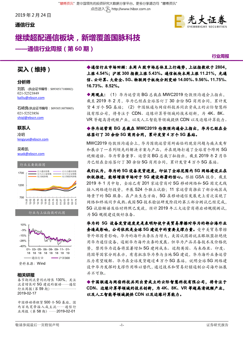 -1-证券研究报告2019年2月24日通信行业继续超配通信板块,新增覆盖国脉科技——通信行业周报(第60期) 行业周报 买入(维持) 分析师刘凯 (执业证书编号:S02) 石崎良(执业证书编号:S05) 联系人冷玥 吴希凯 行业主要数据图资料来源:Wind 相关研报春节期间流量同比增长130%,关注流量增长对5G建设的驱动——通信行业周报(第59期)…………………2019-02-17 中国移动将租赁500个5G基站,国内百兆宽带接入成主流——通信行业周报(第58期)……2019-02-01 行业与上证指数对比图◆通信行业市场回顾:本周A股市场总体呈上行趋势,上证指数收于2804,上涨4.54%;沪深300指数上涨5.43%。